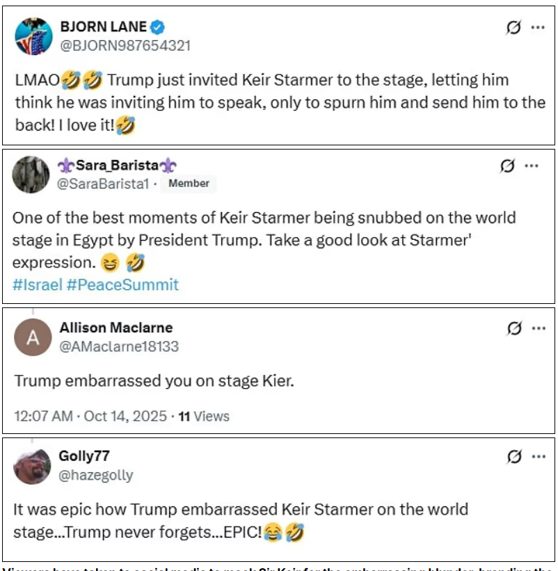 Storbritannias statsminister Keir Starmer ble gjenstand for massiv latter på nettet etter en pinlig scene under Donald Trumps tale i Sharm el-Sheikh, skriver Daily Mail.