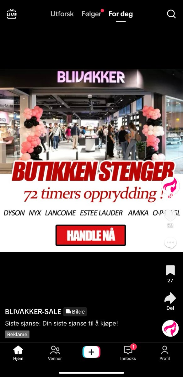 Det får TikTok-brukere opp når de blar på TikTok. Profilen som annonserer budskapet utgir seg for å være skjønnhetsbutikken Blivakker.