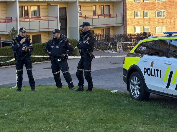 Politiet har sperret av et område utenfor en blokk. Det benyttes hundepatruljer i området, og politiet har sikret spor litt bortenfor blokka.
