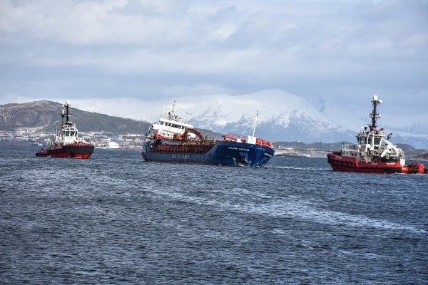 BLE SLEPT: Her er «Hagland Captain» i ferd med å bli slept inn til kai på Averøy etter motorhaveriet i 2019.