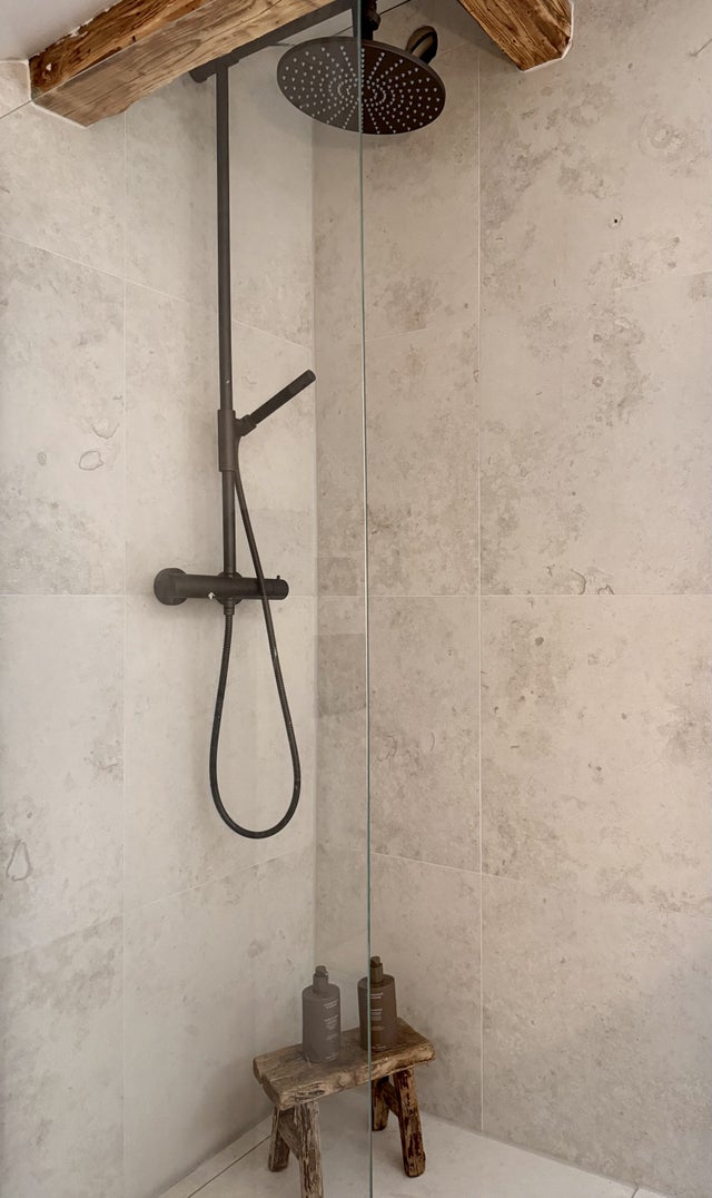 Et sluk som ligger helt inn mot veggen gir badet et rent og moderne uttrykk – og gjør dusjsonen både romsligere og enklere å holde ren.
