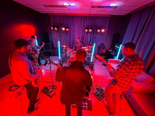 FULL FEST: The Hit Revivers inviterer til fest på Folkvang i Geithus 1. november. De lover god stemning, masse lys, lyd og moro. Her er bandet på øving i Katfoss. Foran fra venstre med ryggen til ser vi Bjørn Formodalen, Thor Henning Jahren og Sverre Broder Lund. Bak til venstre står Chris Arnar Nerland, mens Nils Einar Hervig spiller trommer.