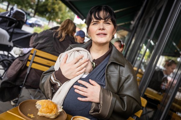 Ulrikke Brandstorp (30) på et bakeri på Frogner i Oslo med sønnen Timotheus på magen.