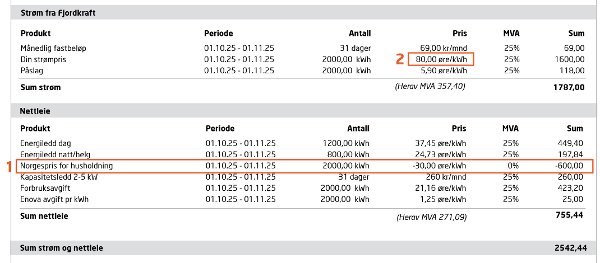 • Selve strømregningen vil vise hvor mye strøm du har brukt, og hva den strømmen har kostet