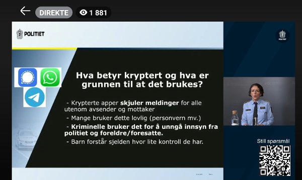 – Vær interessert i hva barnet ditt holder på med på sosiale flater. Vi voksne er for naive. Det er ingen grunn til at et barn eller en ungdom skal gå rundt med en kryptert app på sin telefon. Det er omtrent som å sende barnet sitt ut i mørket uten noen som helst oppfølging, sier Astri Johanne Holm på et digitalt foreldremøte søndag ettermiddag.