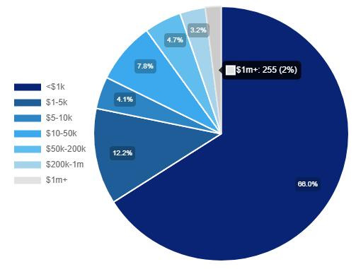 Knappe 255 av 12 796 spill har hatt en omsetning på over en million dollar.