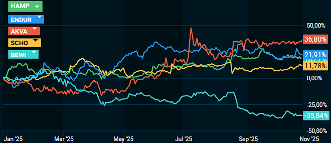 Kursutvikling børsnoterte leverandørbedrifter til havbruk i 2025. Kilde: Infront