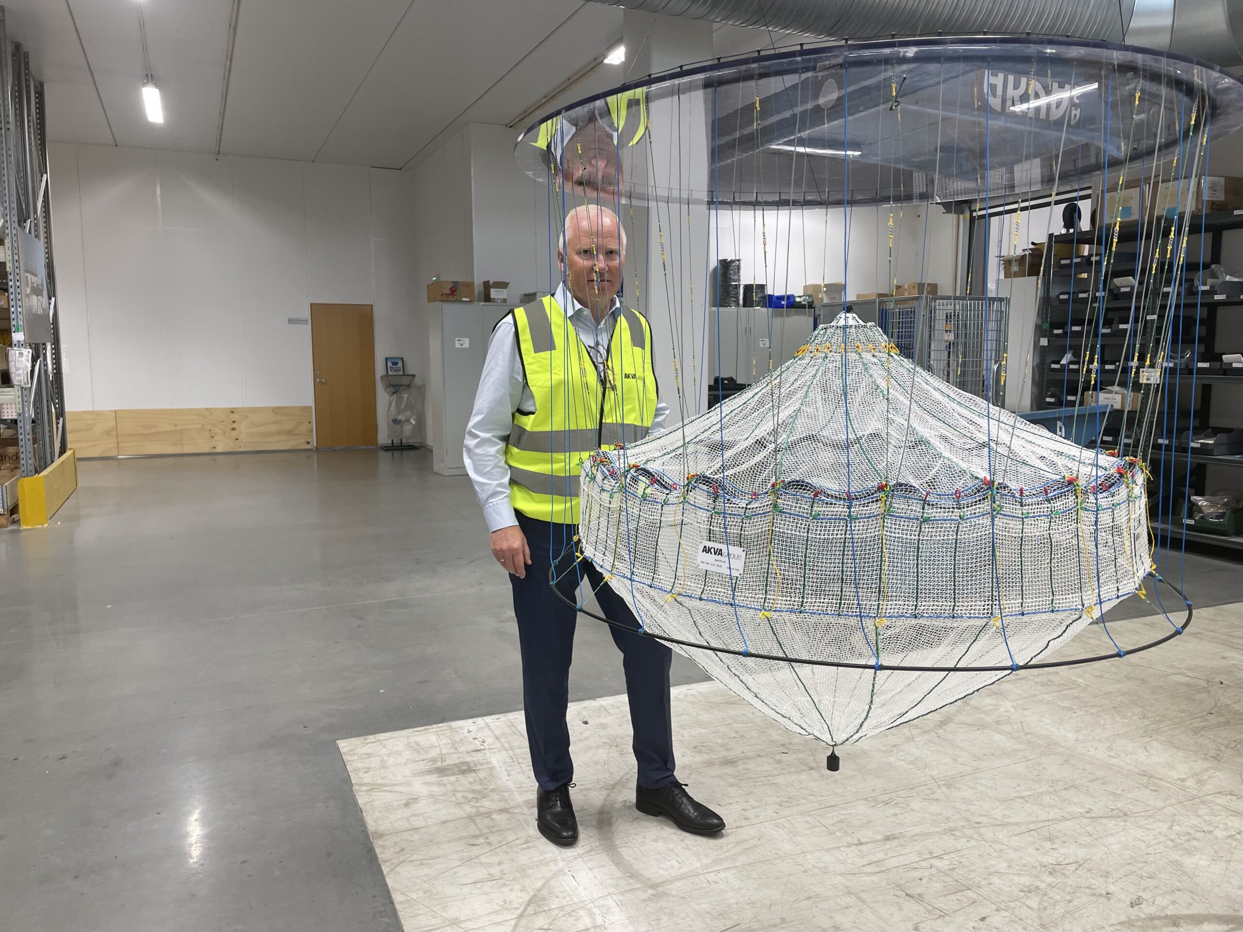 AKVA group-sjef Knut Nesse viser frem en modell av selskapets nedsenkbare merder. Foto: Aslak Berge