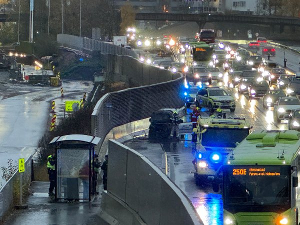 To av tre kjørefelt var åpne for trafikk mens nødetatene jobbet på stedet, det skapte mye kø bakover mot Skøyen.