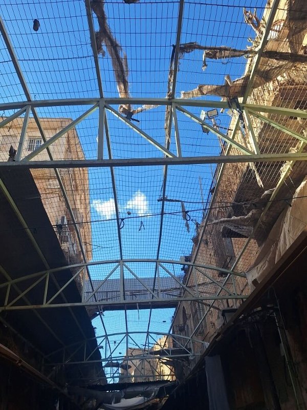 Over mange av gatene i Hebron er det gitter, fordi bosetterne ofte bor høyt og kaster ned ting på palestinere. For eksempel steiner, avføring eller flasker med urin, forteller Furnes.