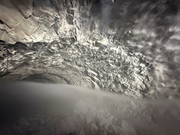Gjennomsyn: – Bildet er tatt øverst på røysa etter siste gjennomslagssalve, før støvet etter salven har rukket å legge seg. Her ser vi tunneltaket og den glatte sprøytebetongen på begge sider av et ca. tre meter langt parti med grov fjellstruktur. Den grove fjellstrukturen er det synlige sporet etter gjennomslagssalven, skriver Vegvesenet.