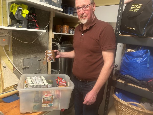 – Så har vi en kasse med hermetikk, kaffe, posesupper og annet med lang holdbarhet. Vi skal fint klare oss en uke, sier mannen som er far til to, hvorav den yngste bor hjemme.