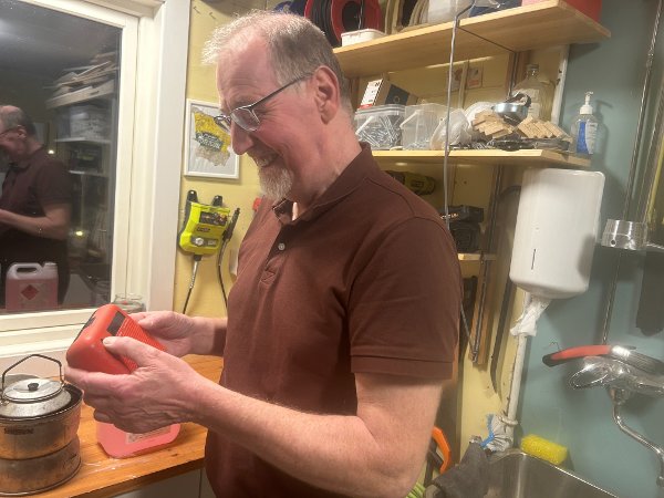 Lars viser oss det gamle stormkjøkkenet sitt, det skriver seg helt fra den gang han var speider, og har vært brukt på et utall turer. Det har sin faste plass i boden. Men han har kjøpt inn ekstra med rødsprit.