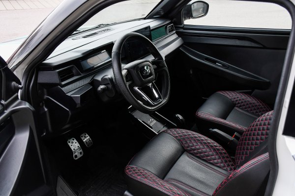 INTERIØR: Skinnseter og ladeplate til mobiltelefonen er selvfølgelig med.