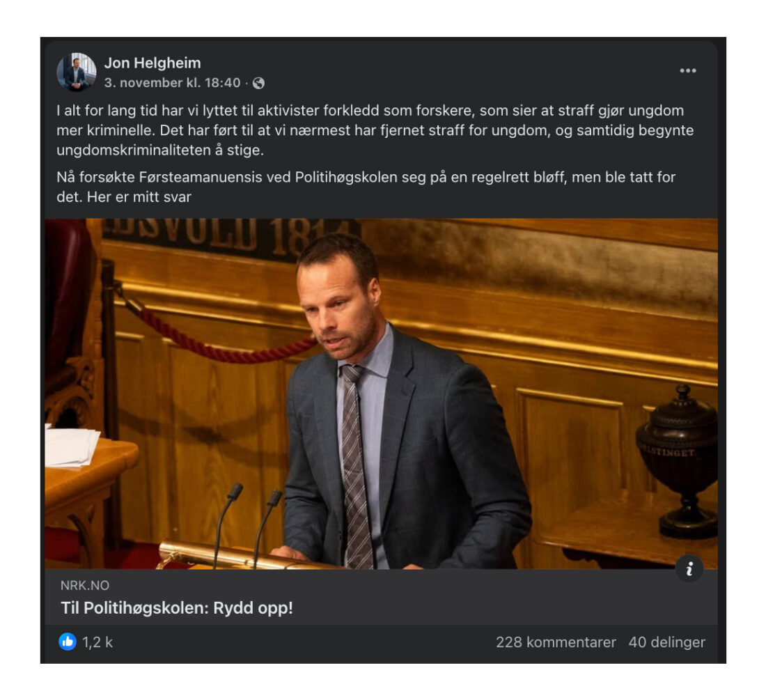 – Det er ikke en tilfeldighet at en førsteamanuensis ved Politihøgskolen glipper på noe så elementært. Da handler dette her om at det er et brudd på tilliten til det Politihøgskolen presenterer. Og det må jo Politihøgskolen rydde opp i. Vi kan ikke ha det sånn at høyt utdannede akademikere og forskere skal være beskyttet mot kritikk eller ha en akademisk frihet til å komme med ting som er bløff. For dette her var en bløff, og det må Politihøgskolen rydde opp i, sier han.