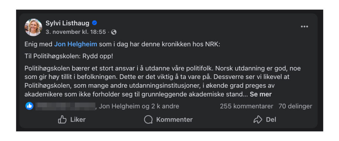 Frp-leder Sylvi Listhaug publiserte senere et innlegg der hun sa seg enig med Helgheim i at Politihøgskolen må rydde opp.