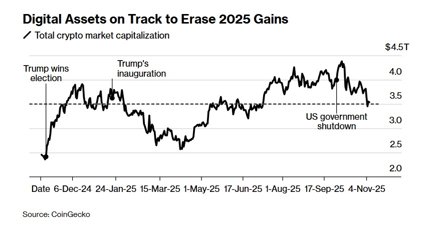 Etter en brutal oktober har kryptovalutaer på litt over en måned slettet nesten all verdiøkningen fra 2025.