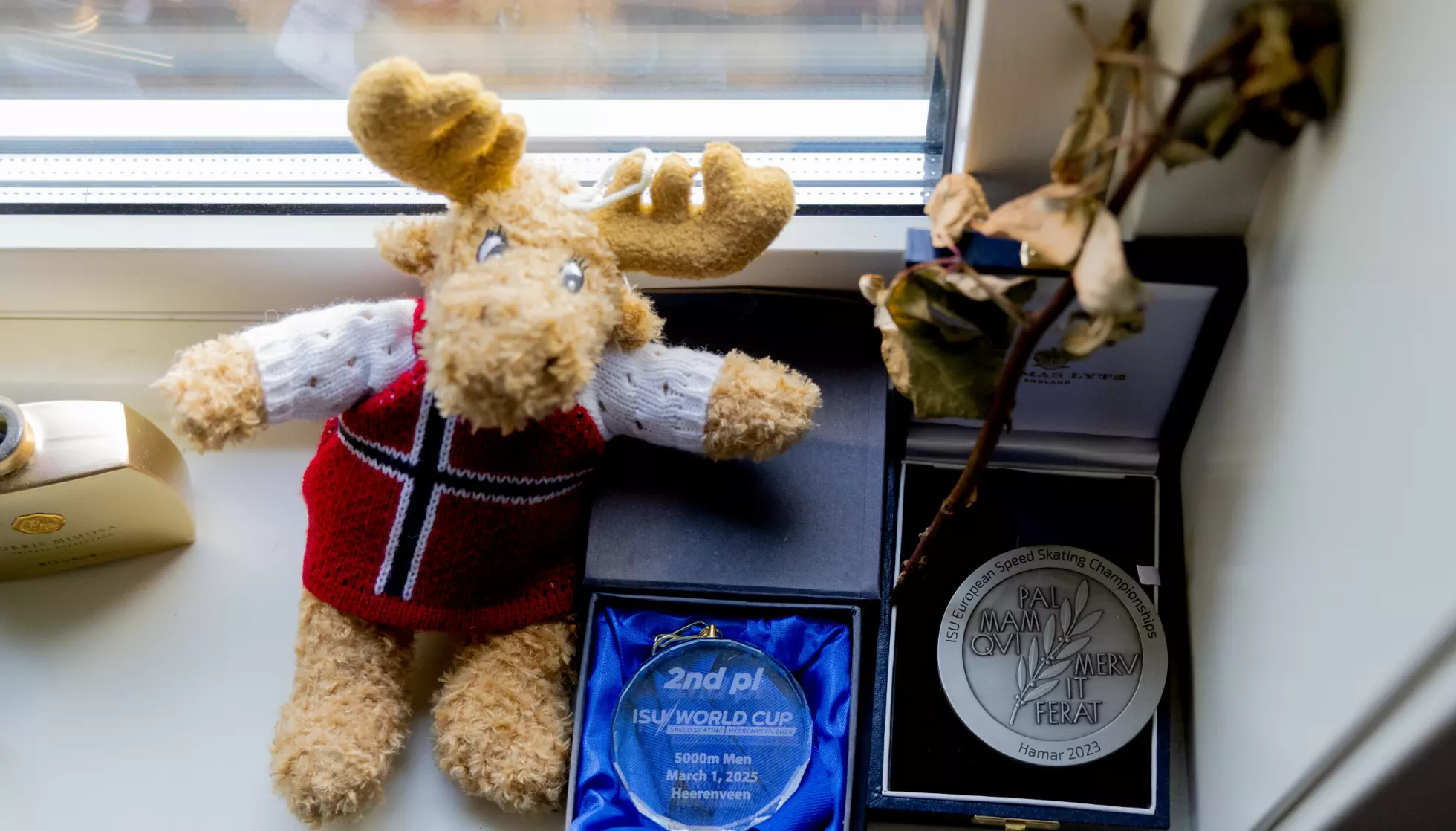 De enkle kårene i leiligheten på Hamar reflekterer kanskje ikke hvor stor stjerne Eitrem har blitt på skøytekartet. En ellevill fjorårsesong ble toppet med VM-gull på 5000 meter i mars – på hjemmebane på Hamar.