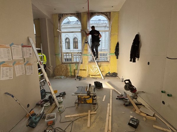 Mesteparten av grunnarbeidet er nå gjort og håndverkerne er allerede i gang med finishen som å legge gulv i den første leiligheten.