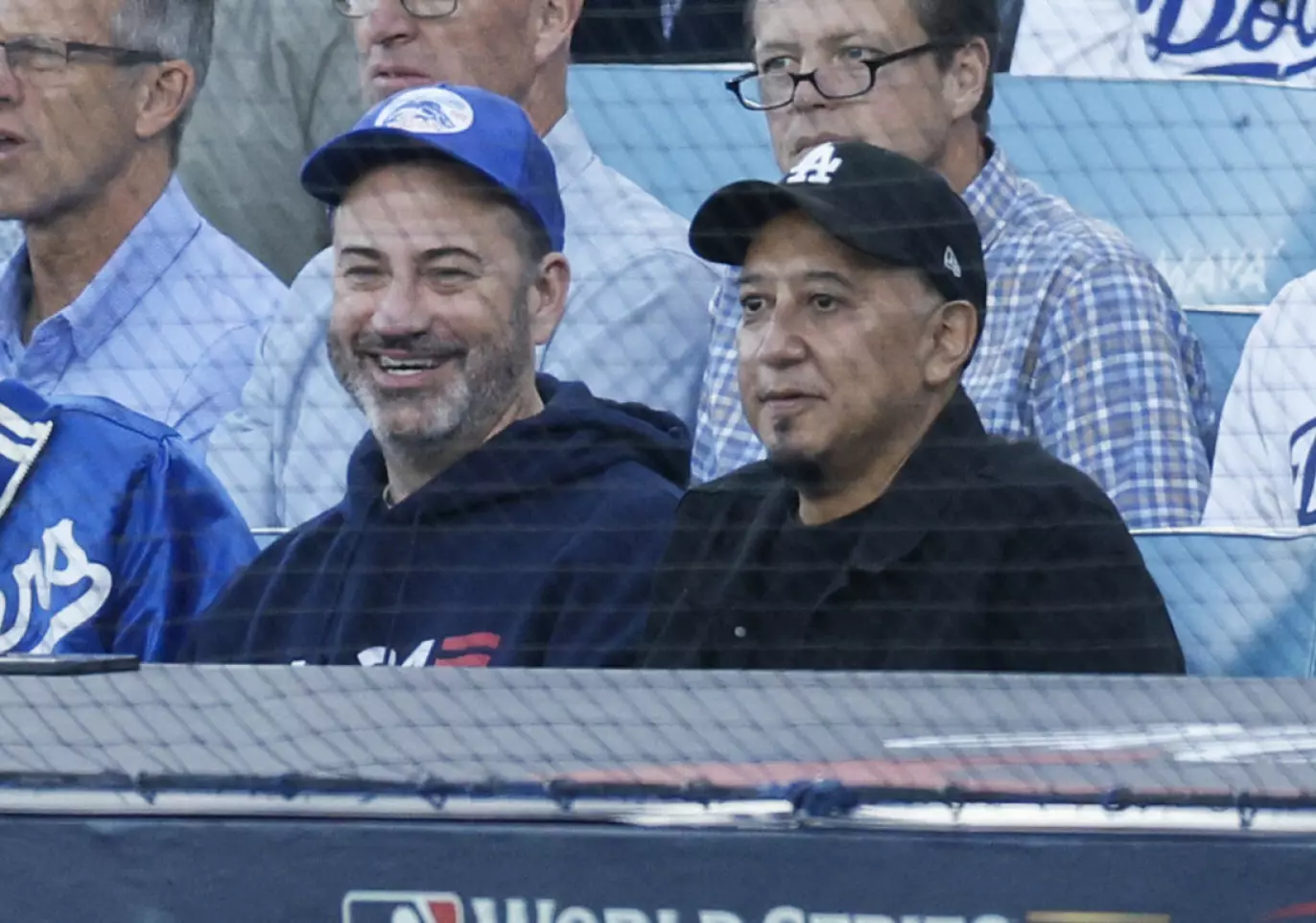 KOMPISER: Jimmy Kimmel og Cleto Escobedo III sammen på baseballkamp i 2024. Foto: Getty Images via AFP/KEVORK DJANSEZIAN/NTB
