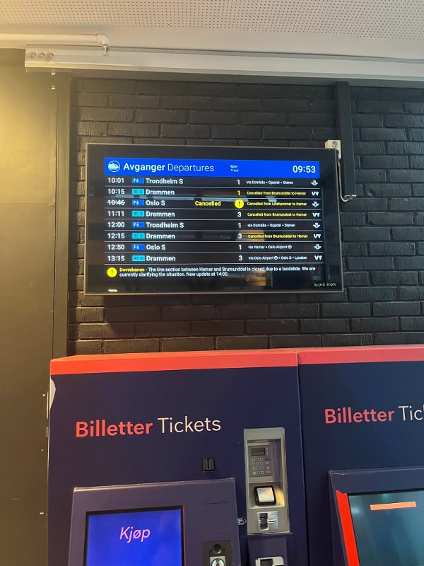 Bane Nor melder på informasjonsskjermene på stasjonene på Dovrebanen onsdag formiddag at strekningen er stengt mellom Hamar og Brumunddal på grunn av jordskred. Hendelsen har skjedd like ved Jessnes stasjon.