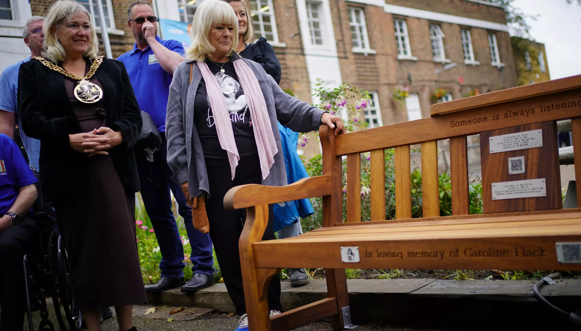 SØRGENDE MOR: På Tottenham Community Sports Centre nord i London er det satt selvmordsforebyggende benk til minne om Caroline Flack. Foto: Yui Mok / NTB