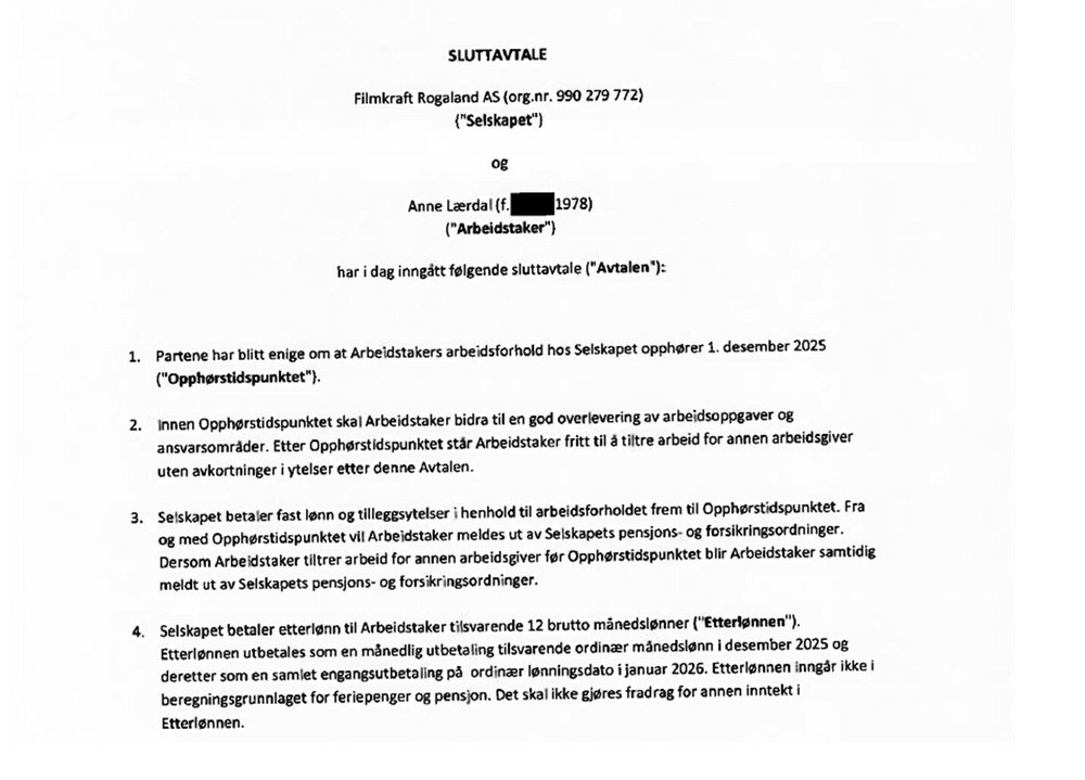 Avtalen seier at ho kan ta ny jobb utan avkorting av beløpet. Lærdal får også dekkja advokatkostnadar på opptil 150.000 kroner.