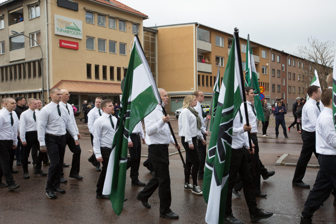Gislingrud i marsj med Den nordiske motstandsbevegelsen i Borlänge i Sverige 1. mai 2016.