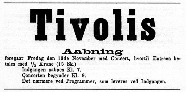 Tivoli hadde dansegulv, restaurant og en scene. Det var celeber åpning 19. november 1875.