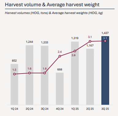Fôringsratene fortsetter å styrke seg med en biologisk fôrkonvertering på 1,30. Kostnadene i tredje kvartal var midlertidig forhøyet på grunn av engangsvedlikehold og infrastrukturoppgraderinger, men implementerte effektivitetstiltak forventes å redusere kostnad/kg fra første kvartal 2026.