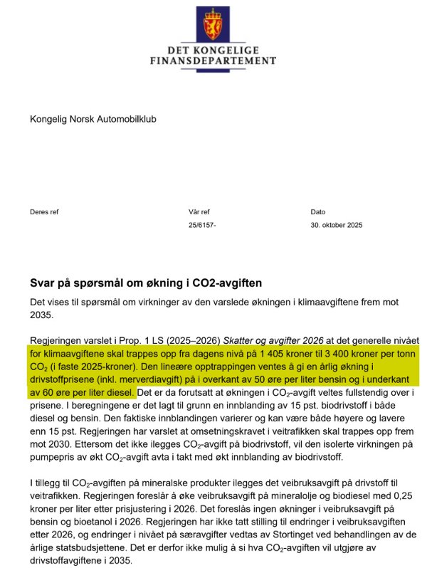 – Regjeringen har ikke tatt stilling til endringer i veibruksavgiften etter 2026, og endringer i nivået på særavgifter vedtas av Stortinget ved behandlingen av de årlige statsbudsjettene. Det er derfor ikke mulig å si hva CO₂-avgiften vil utgjøre av drivstoffavgiftene i 2035.