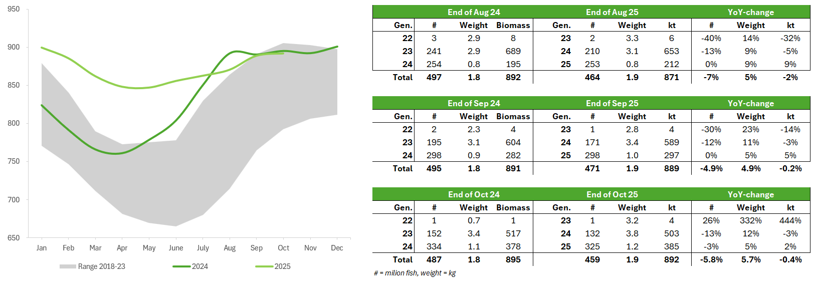 “Som vi har sett de siste ukene, begynner markedet allerede å stramme seg til, og slaktetempoet vil avta ytterligere. Som vi har fremhevet i våre tidligere biomasseoppdateringer, er det ventet at 24-generasjonen (der individene er ned med 13 prosent år over år) skal høstes mellom nå og sommeren 2026. En tosifret nedgang i antall individer fra år til år er ganske betydelig, og vi går inn i det nye året med et helt annet grunnlag enn i fjor. Selv om høyere vekter kan oppveie noe av effekten på tilbudsveksten inn i neste år, tror vi at første halvår begynner å se stadig mer stramt ut.”