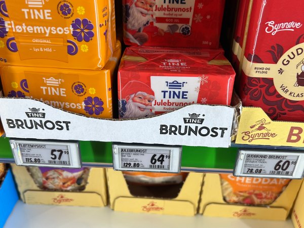 LIKE FØR: Tidlig fredag morgen hadde Kiwi ikke rukket å sette ned prisen på julebrunosten.