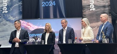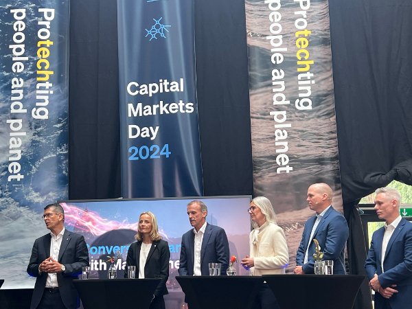 LEDELSE: Konsernsjef Geir Håøy, Mette Toft Bjørgen (CFO), Eirik Lie (KDA), Lisa Edvardsen Haugan (Kongsberg Maritime), Martin Wien Fjell (Kongsberg Discovery), Shane McArdle (Kongsberg Digital) under kapitalmarkedsdagen i 2024.