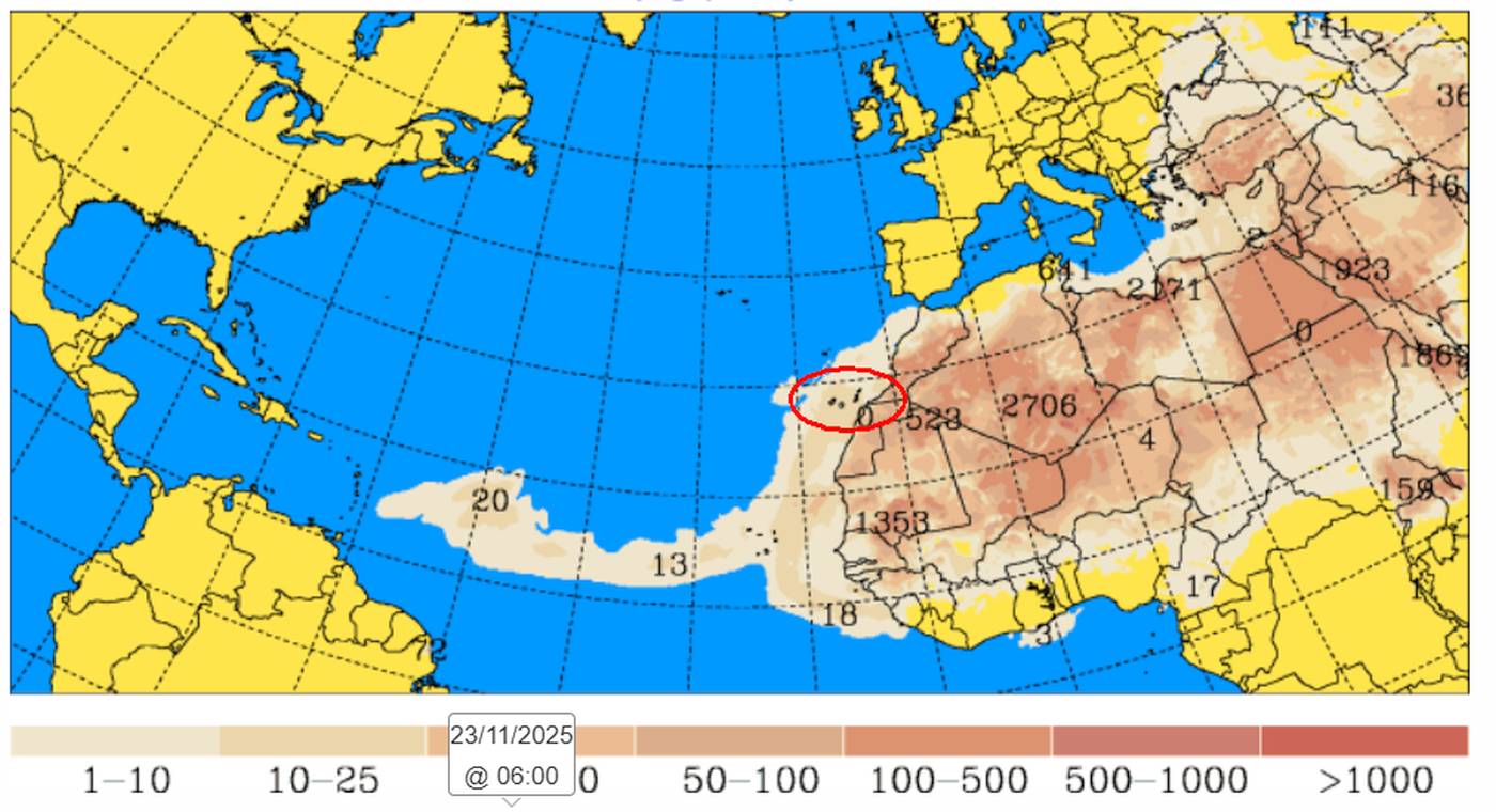 Varme luftstrømmer vil komme inn over Kanariøyene når DANAen svekkes, og det kan bli en middels tett calima, det vil si mikroskopiske sandpartikler fra Sahara som legger seg som en sanddis på Kanariøyene.