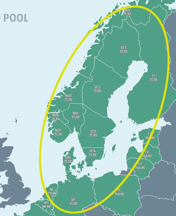 I løpet av natten og morgentimene forsvinner alle prisforskjeller mellom Norge, Tyskland, Sverige, Danmark og Finland. Også Nederland og Belgia får praktisk talt samme pris.