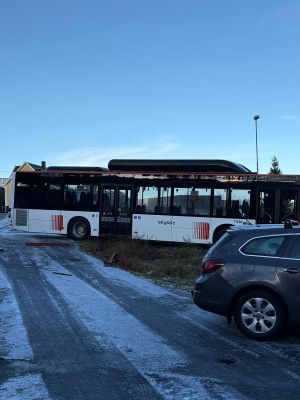 Rett etter klokken 13 får BA tilsendt bilder av en buss ved Cirkle K på Haukås i Åsane som har mistet kontrollen, kjørt i et postkassestativ, og knust frontruten.
