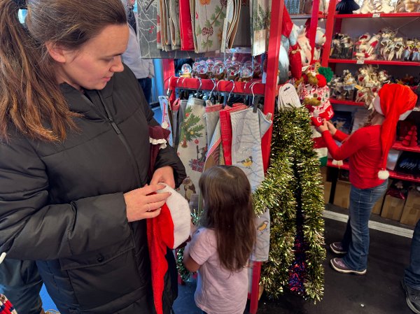 Døtrene Jenny (3) og Julia (5), har fortapt seg i noen lange remser med juleglitter inne i en av bodene som selger julepynt. Julia har for anledningen allerede tatt på seg nisseluen, og det ser ut til at hun ikke synes julestemning i november er noe å stille spørsmål ved.