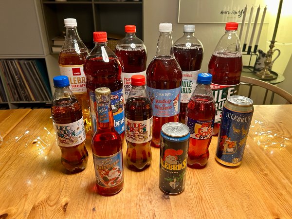Ni av de 12 julebrusene kom fra plastflasker, en fra glass og to fra boks. Det var ganske lav intensitet av emballasjesmak.