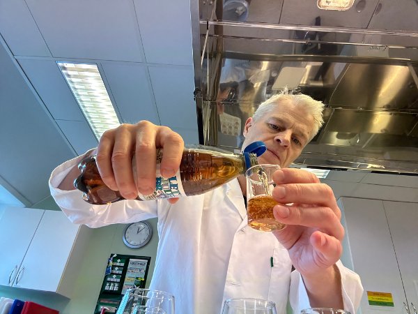Testen starter med at ni glass blir sirlig fylt med nøyaktig 40 milliliter i hvert av dem. Et glass til hver smaksdomme. På toppen setter testansvarlig Mats Carlehøg et plastlokk.