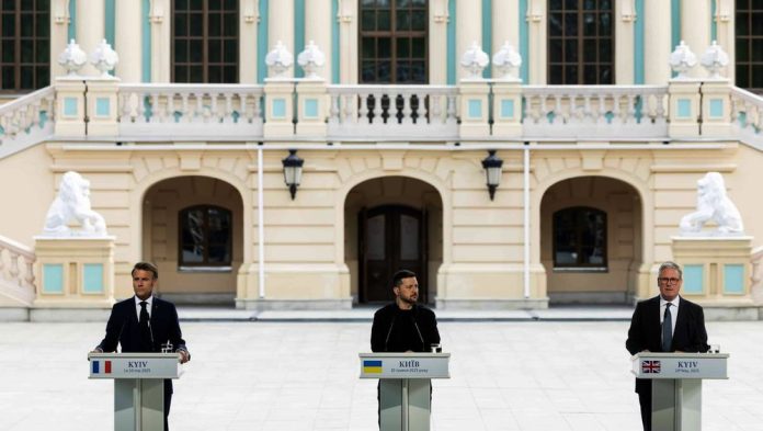 05.10.2025. Kiev, Ukraina. Statsminister Keir Starmer, Emmanuel Macron, Frankrikes president, og Friedrich Merz, Tysklands forbundskansler og Polens statsminister Donald Tusk møtte Volodymyr Zelensky, Ukrainas president, under et besøk i Ukraina. Bilde av Simon Dawson / No 10 Downing Street