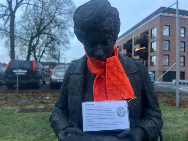 DEN FØRSTE: Klara Skoglund-statuen ved Askim togstasjon var byens første statue til å bli kledd i oransje skjerf.