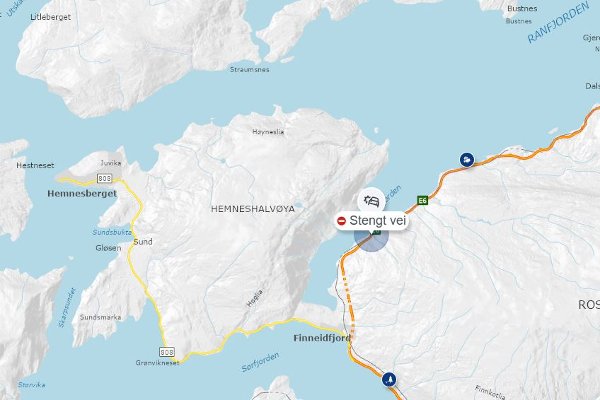 Ifølge Statens Vegvesen sin oppdatering har ulykken skjedd ved Kattstranda som er like nord for tettstedet Finneidfjord.