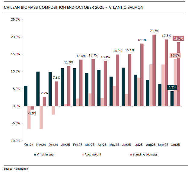 “Med en andel stående biomasse over fem kg på 32 prosent i oktober 2025 mot 22 prosent i oktober 2024, forventer vi fortsatt solid volumvekst på kort sikt og press på storfiskpremium. Vi ser mer begrenset tilbudsvekst på lengre sikt (vi forventer en økning i tilbudet i Chile på 2–6 prosent) i 2026–27, støttet av en 12-måneders rullerende smoltutsettingsrate på 3,7 prosent og forhøyede lakselusnivåer, noe som kan påvirke en relativt liten økning i antall individer (+4,3 prosent) negativt hvis sommersesongen viser seg å være utfordrende.”