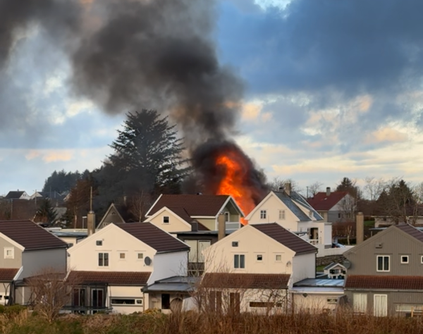 Brannen er i Håkon Aasbøs veg, nær krysset til Vestre Veaveg. Politiet advarte folk mot å nærme seg brannstedet