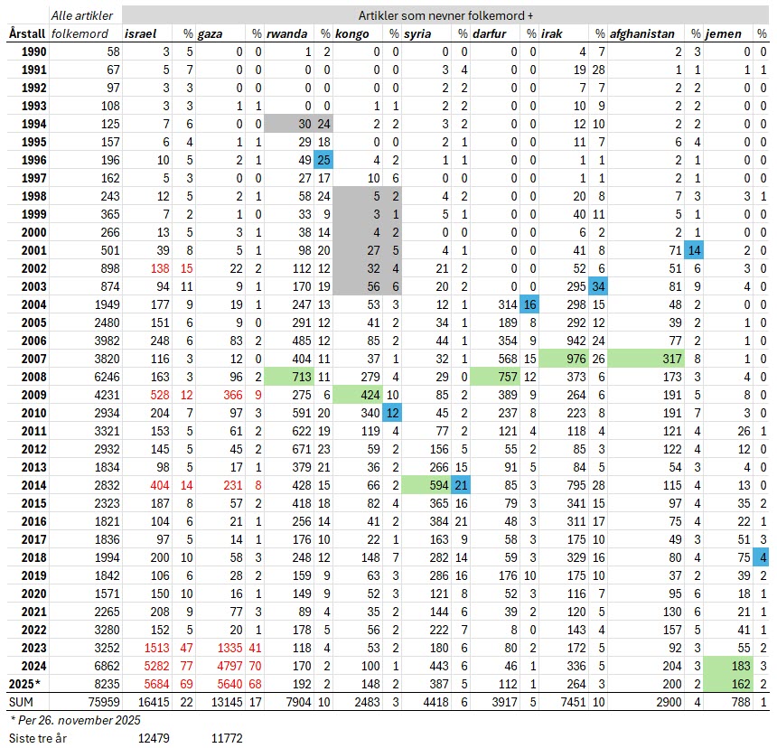 I juni 2024 publiserte MIFF tall fra Mediearkivet Atekst som viser hvordan alle redaktørstyrte medier i Norge har brukt ordet «folkemord» siden 1990. Denne tabellen er nå oppdatert med tall for 2025 frem til og med 26. november.