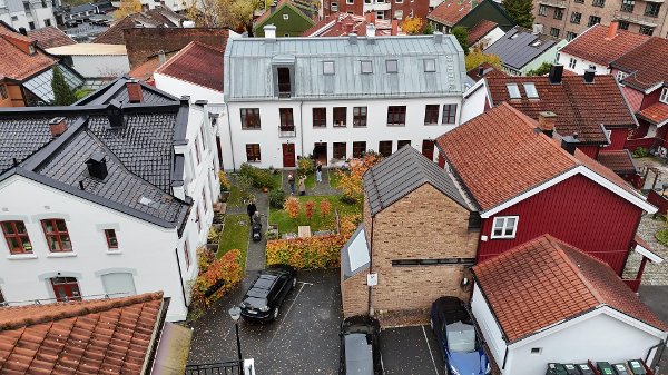 – Trehusenes vennlige saltak er brukt på en måte som skaper fine gavler både mot gaten og et felles gårdsrom. Mursteinene er brukt for å skape dybde og interessante detaljer, mens bjelkekonstruksjonen stikker ut gjennom et glassfelt på en måte som nesten kan minne om den doriske søyleordenens triglyfer og metoper, skriver Arkitekturopprøret om tilbygget.