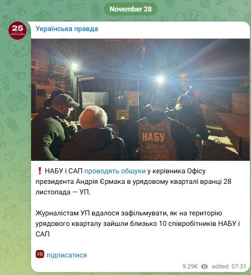 RANSAKING: – NABU og SAPO gjennomsøker boligen til sjefen for presidentens kontor, Andriy Yermak, i regjeringskvartalet morgenen 28. november, skriver Ukrainska Pravda på Telegram.