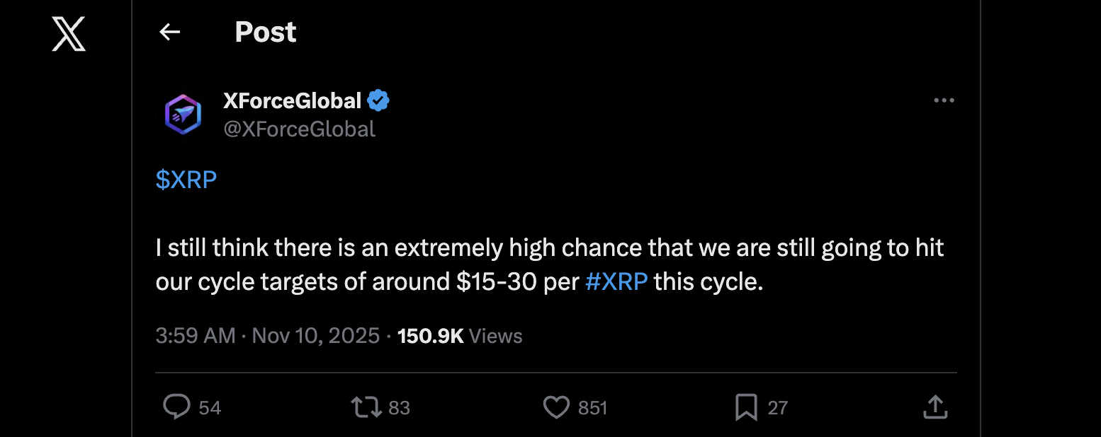 XForceGlobal, pierwszy koreański certyfikowany analityk fal Elliotta, twierdzi, że XRP nadal ma duże prawdopodobieństwo osiągnięcia poziomu 15–30 USD przed zakończeniem obecnego cyklu rynkowego. Jego prognoza opiera się na wzorcach fal Elliotta i szerszych tendencjach wzrostowych wokół tego aktywa.