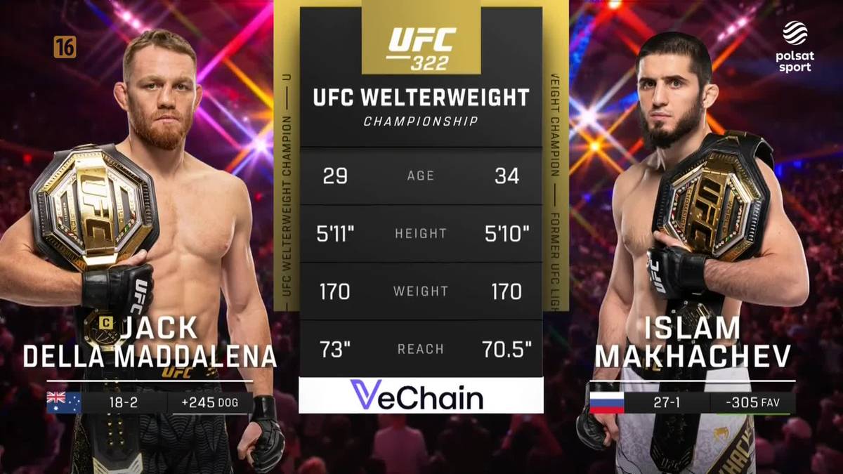 W walce wieczoru gali UFC 322 naprzeciwko siebie stanęli Jack Della Maddalena (18-3) i Islam Makhachev (28-1). Po pięciu jednostronnych rundach drugi z wymienionych zawodników przechylił szalę zwycięstwa na swoją stronę dzięki jednogłośnej decyzji sędziów. To oznacza, że zdobył pas mistrzowski już w drugiej kategorii wagowej.
